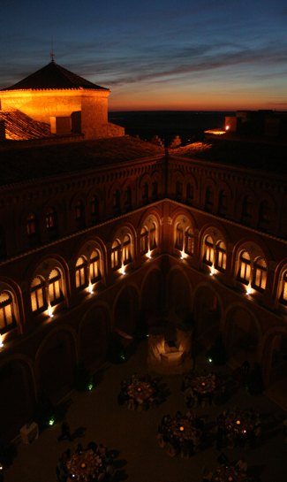 Tras el aperitivo, los novios pasaron al patio del castillo acompañados por la insuperable voz de Frank Sinatra cantando «Strangers in the Night». La cena daba comienzo. El vino corrió por la mesas hasta bien entrada la madrugada en la que los novios y sus invitados abandonaron el Castillo de Belmonte.
